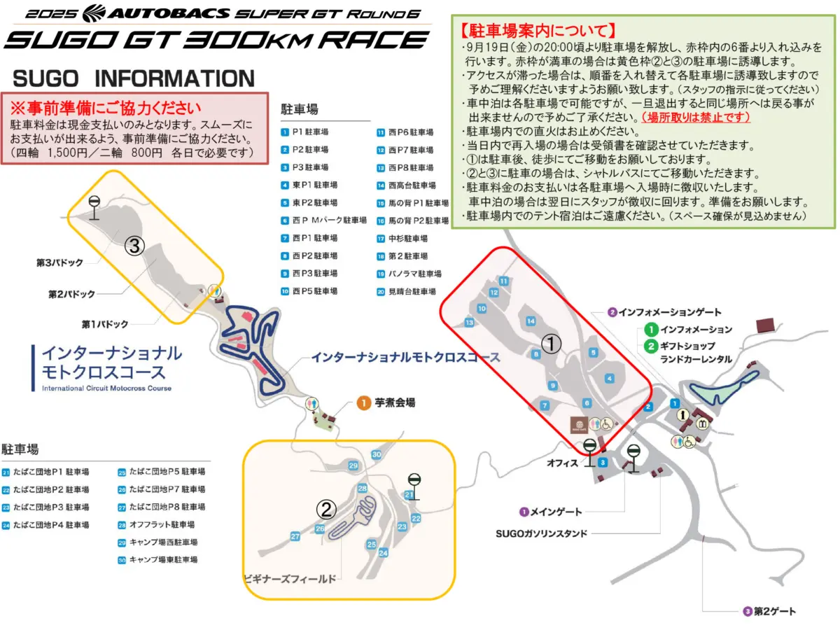 スポーツランドSUGOが公開していた駐車場は以下の通りだ。お値段は4輪車だと1500円、2輪車は800円というお値段。