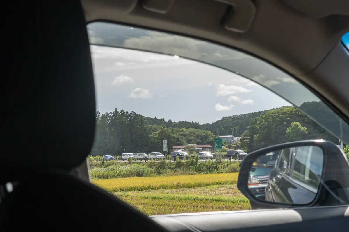 加えてスポーツランドSUGOまでの道が写真に写っている道路以外に無く、高速から降りてきた車だけでなく自分たちのように一般道から来た車も全て同じ一本道に入っていくことから大きな渋滞が生まれていた。