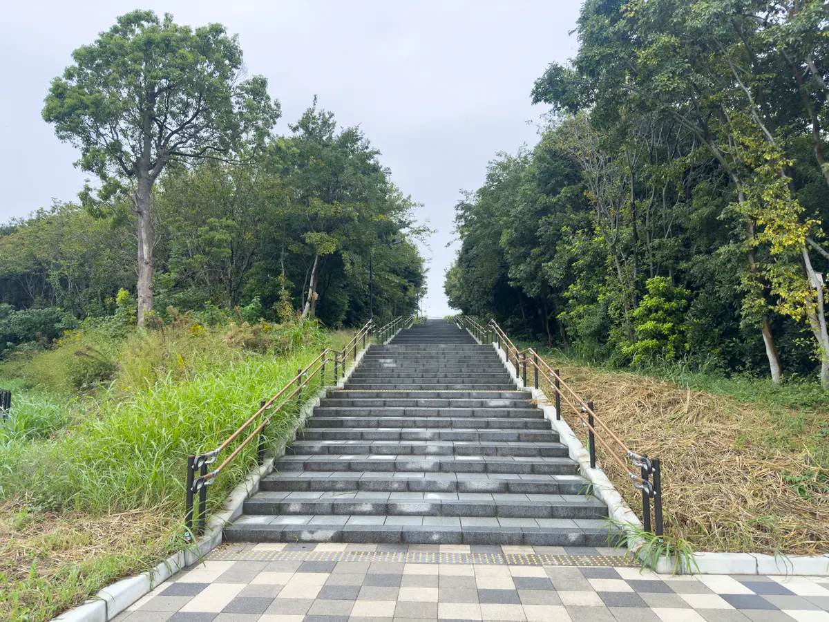 園内へ続く階段が現れる。埋め立て地だからと言ってフラットな作りにはなってない。結構長い階段だ。