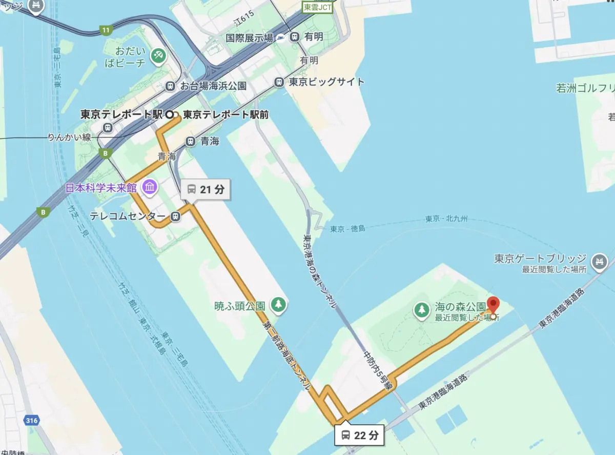 というわけで30分程度の滞在で公園を離れることにした。先程のバス以外にも、ここ海の森公園近くからはバスが出ている。都営バスがお台場の中心地・東京テレポート駅まで路線を繋げている。