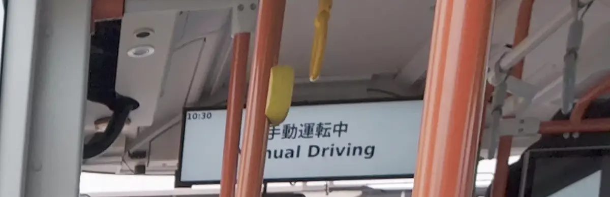 すると運転席にバス運転士さんが。いや、いて当然なのかもしれないが、違和感がある。このバスは「自動運転」と聞いていたのだが・・・更にフロントガラス部分の上にはディスプレイがあり、