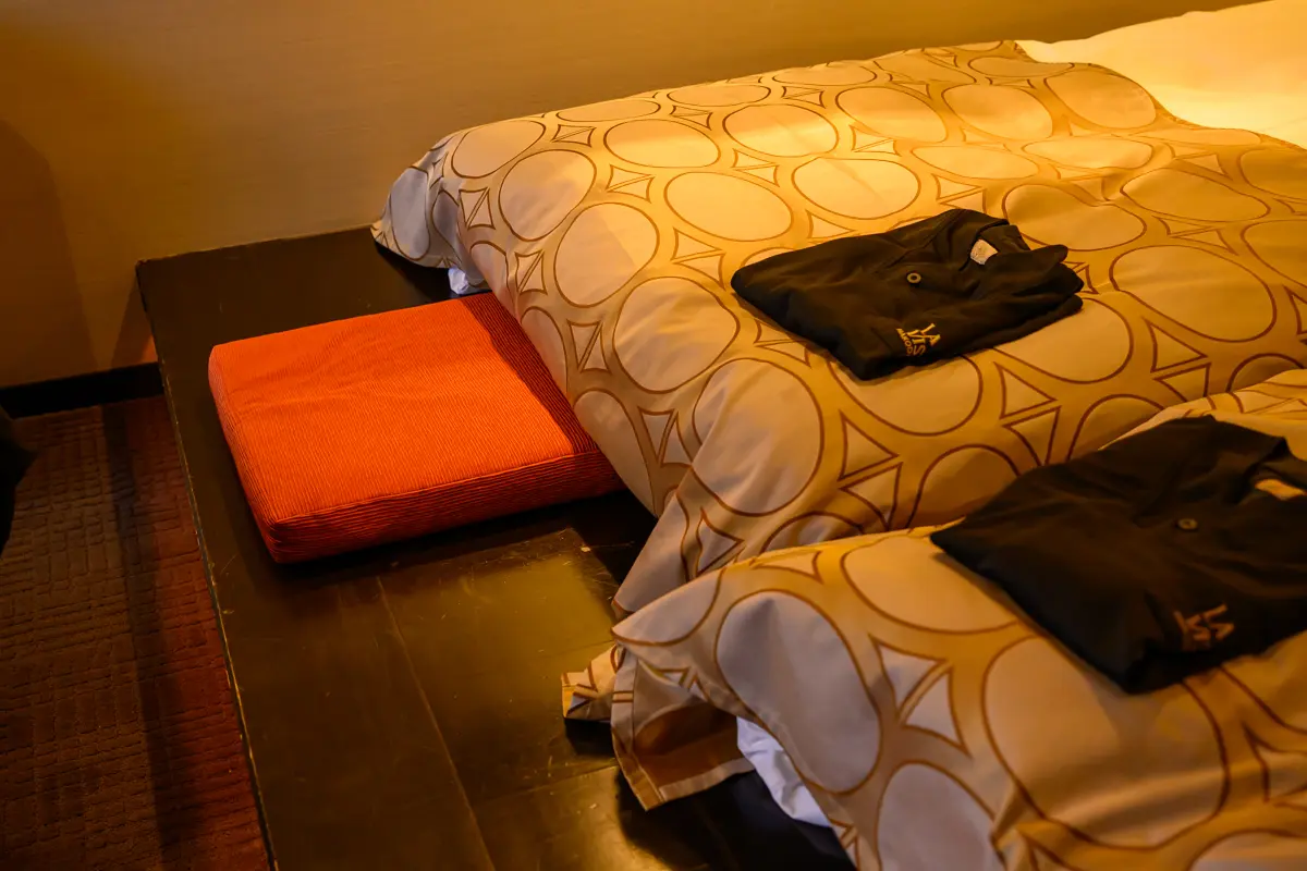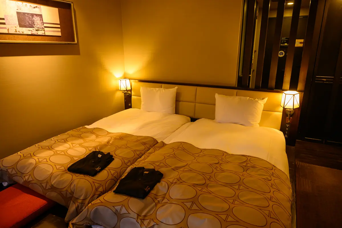 ベッドは前述の通り、ツインルームなので2つ並んでいる。上にはルームウェアも用意されている。