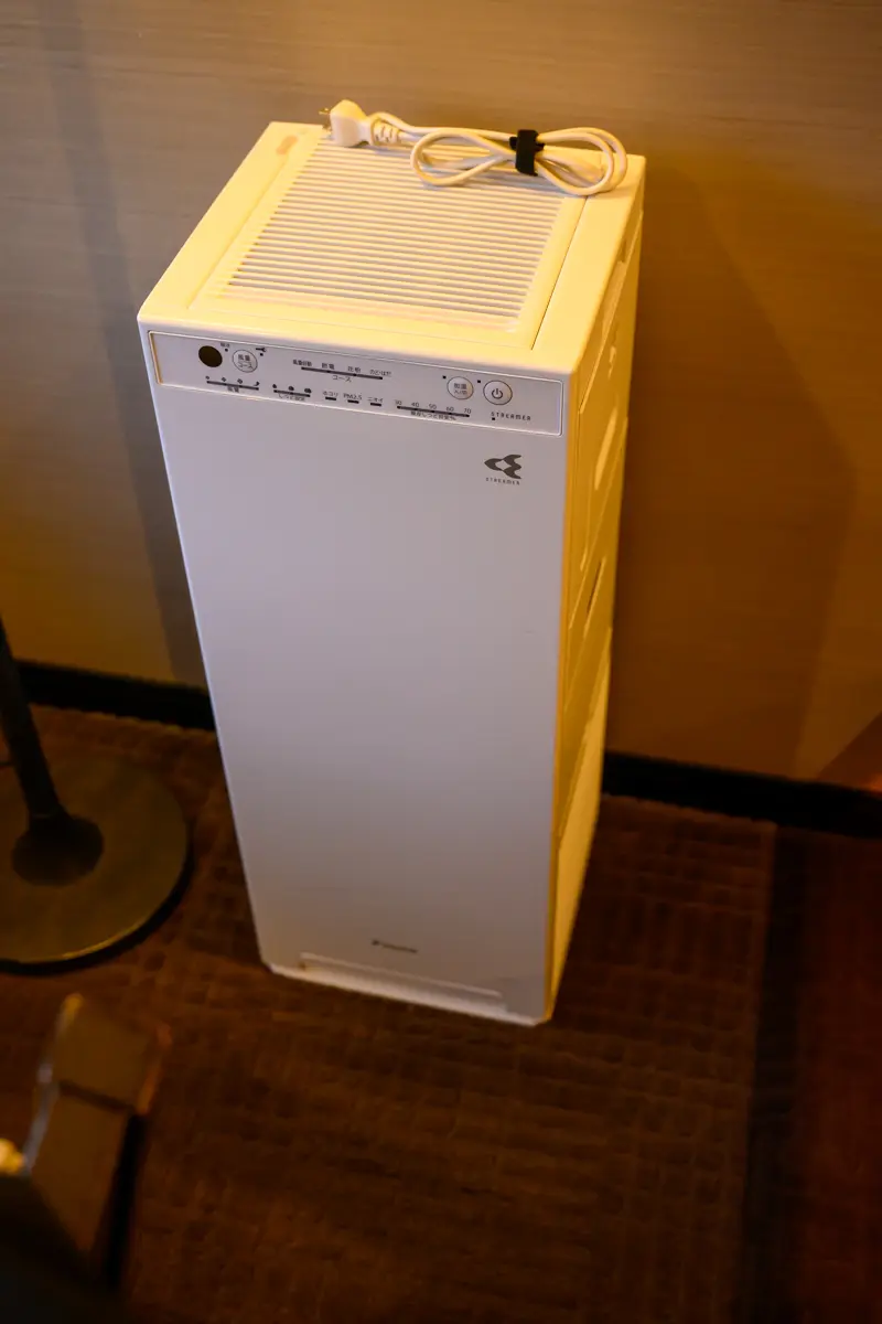 ダイキンのストリーマという空気清浄機が用意されていて、横には水を入れるタンクもあり、加湿することもできる。