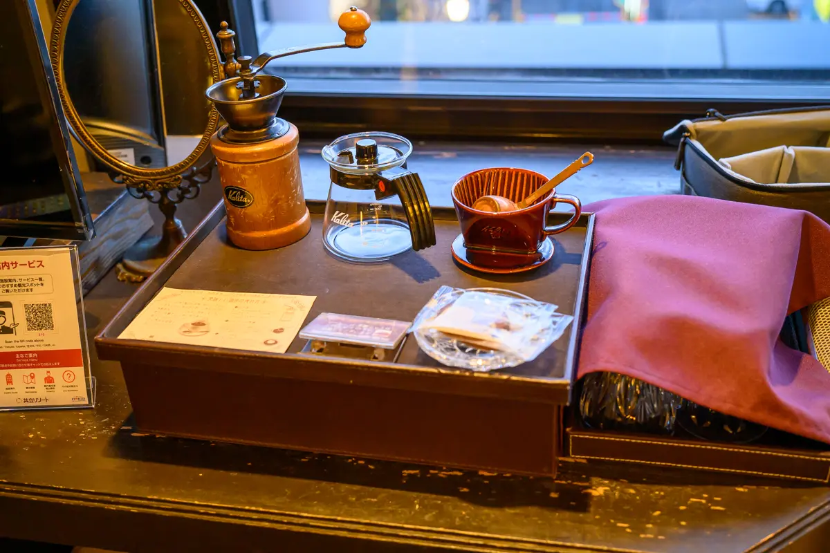 また横にはコーヒー類も用意されている。自分で豆を挽いて、ドリップして、ウメェ!という感じで楽しむことが出来る。ただ、ドリップの方法がわからず断念したのはここだけの話である。