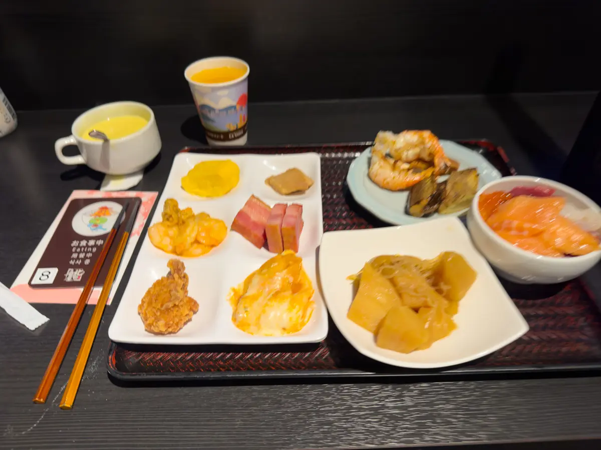 サーモン、いくら、マグロ、イカ・・・これら全部盛り放題である。自分は朝から大量に食べるとその分お腹も大変調子良くなってしまう人間なので、控えながら食すことが多いのだけども、調子に乗って綺麗に盛り付けた。