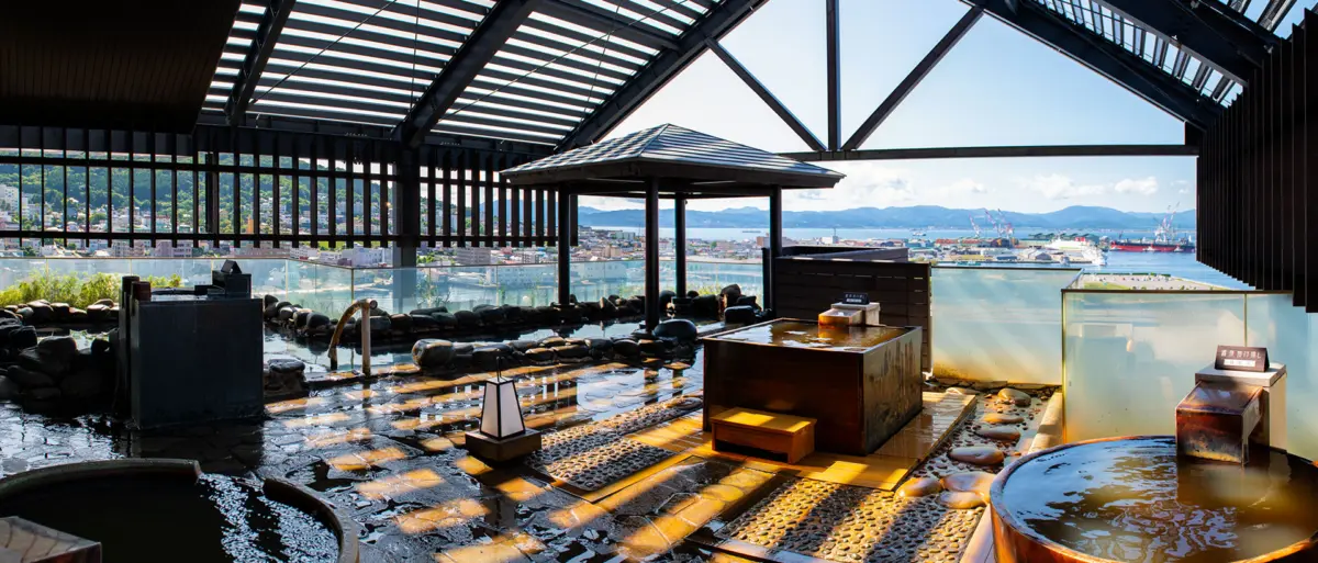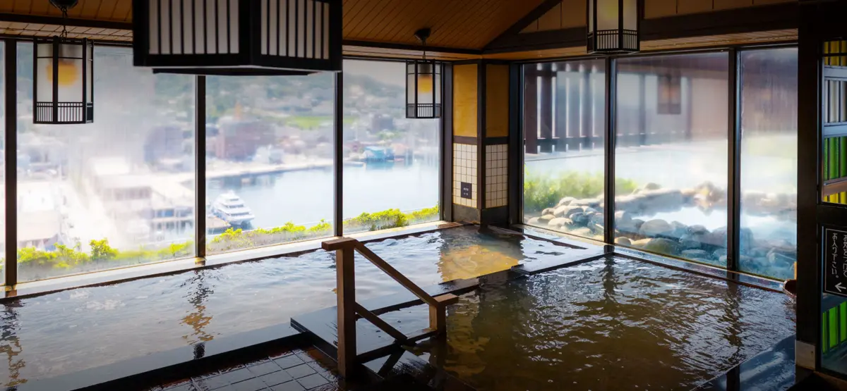 「海峡の湯」と名付けられた大浴場、中からは赤レンガ倉庫や函館山を見ながら湯に浸かることができる。