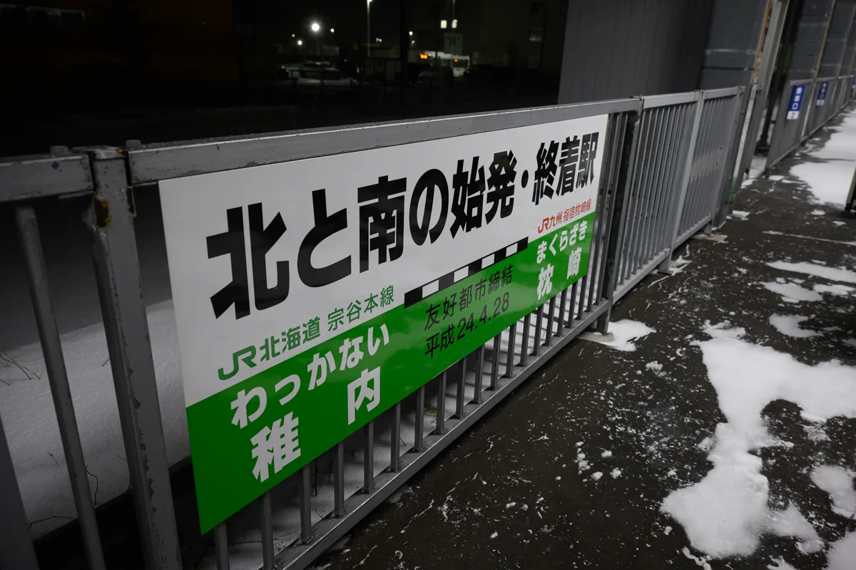「北と南の始発・終着駅」という看板が。北には稚内、南にはJR九州の枕崎駅がある。