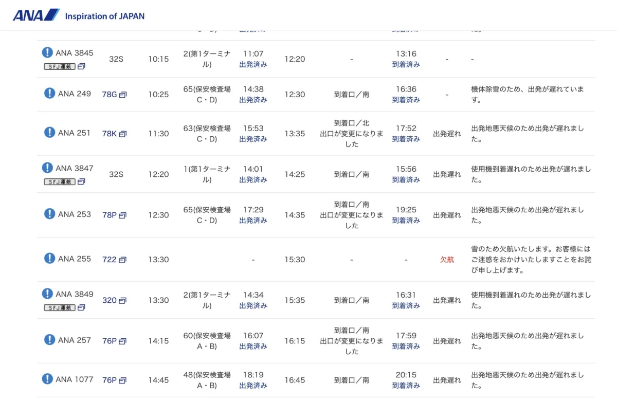 乗り込んだ飛行機は順調に羽田空港にやってきたのは良いものの、除雪作業に難儀し、結果として40分以上の遅れが発生した。乗っていた時点で「いやぁハズレを引いたなぁ・・・」と後悔していたが、その次の便では8時30分発だというのに何故か13時17分発になったり、